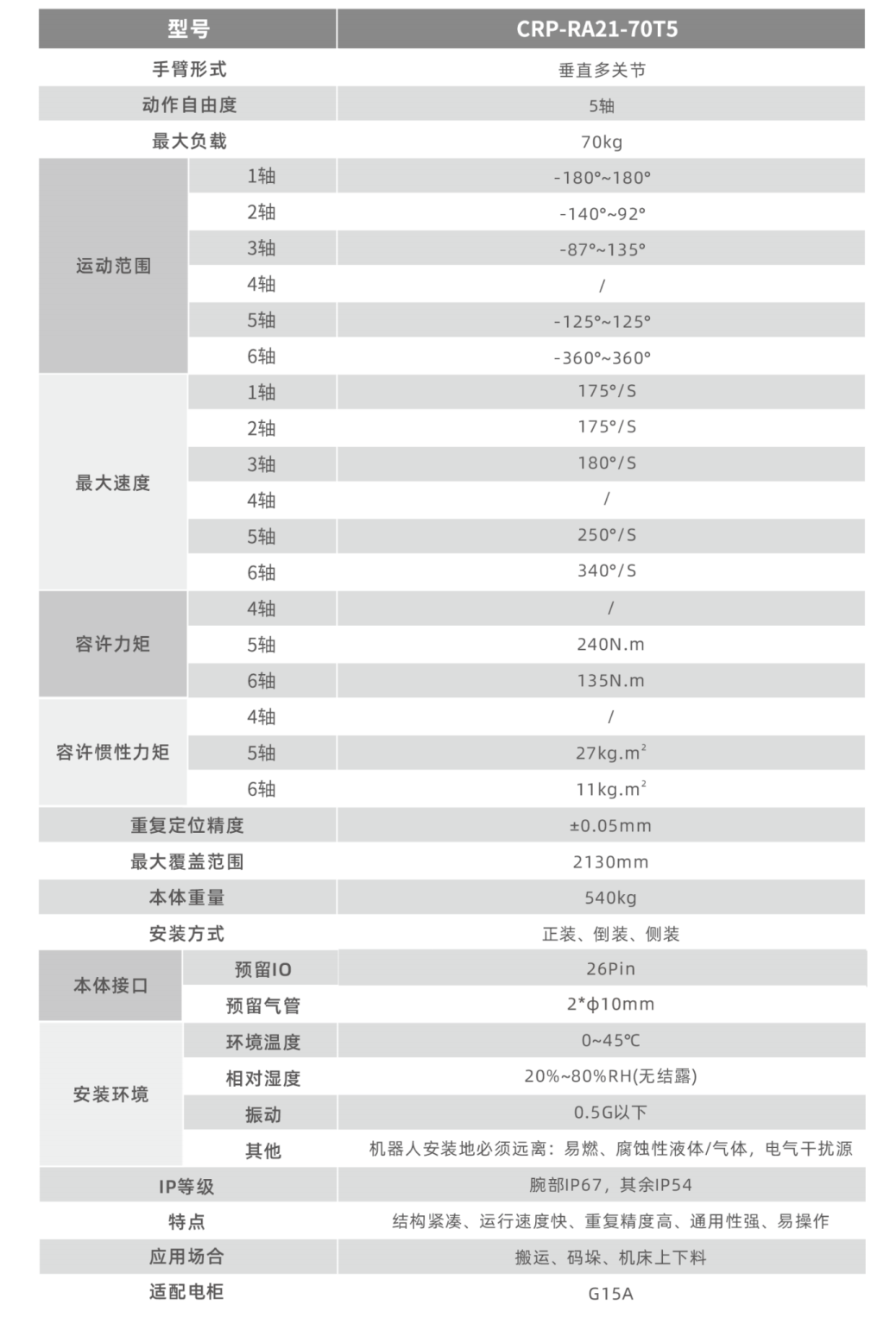 运行速度快,重复定位精度,适用于搬运、装配、打磨等场景。